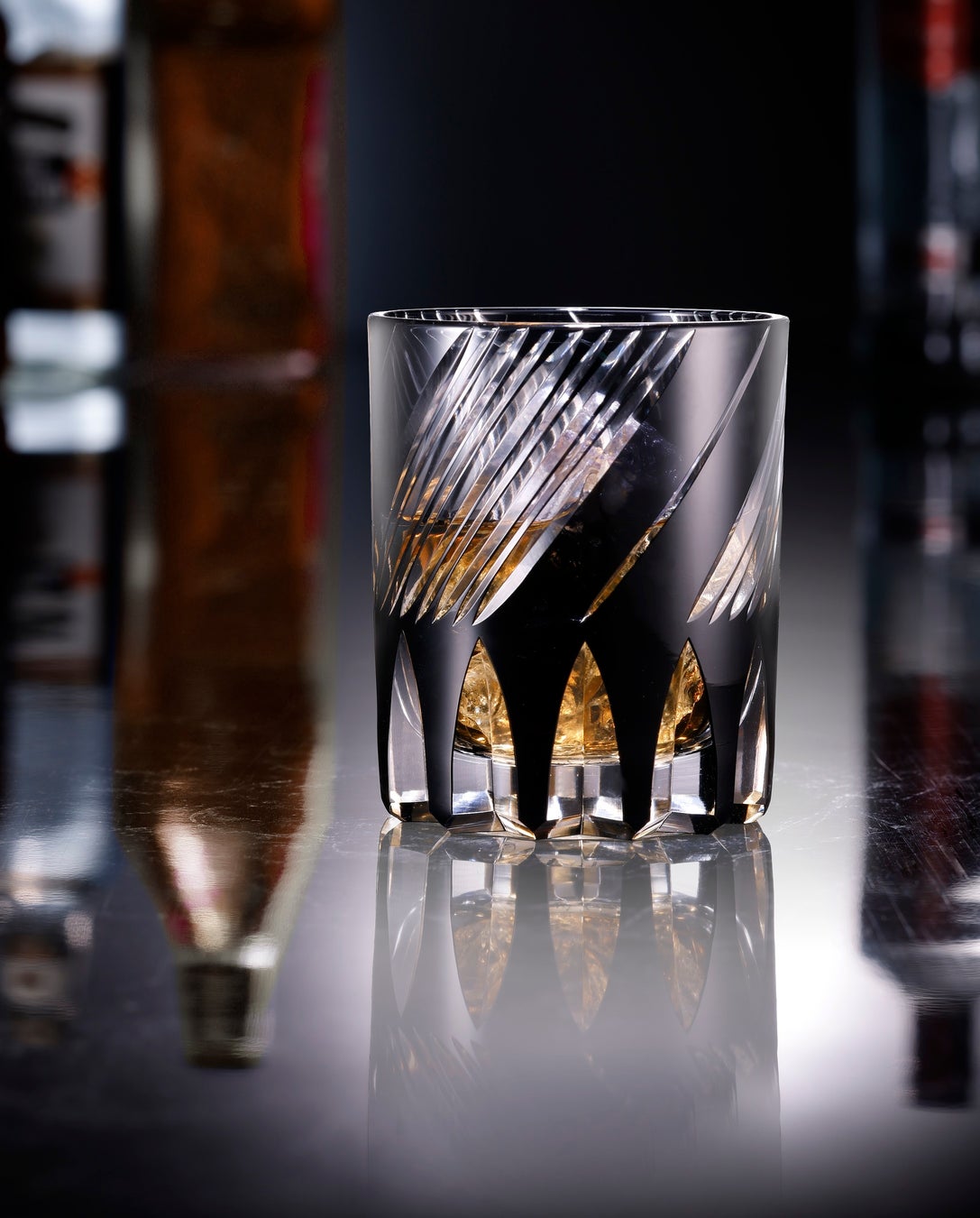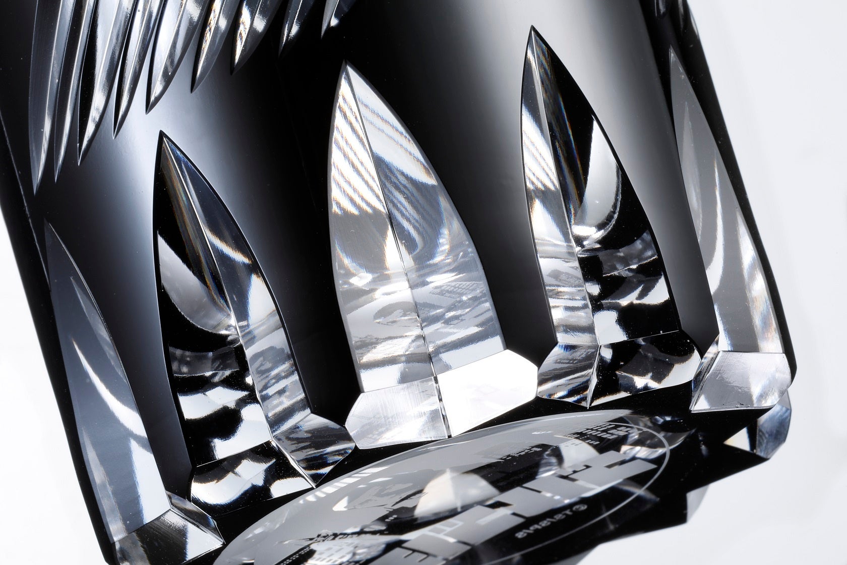 特筆すべきは従来の江戸切子に見られるような鮮やかな色使いではなく、「黒切子」と呼ばれる漆黒の色ガラスであること。黒切子は光が透けないので、全体のバランスを見ながら削り加工していくのがとても難しいですが、本品は優れた技術によって、銃の砲腔(ほうこう)内に刻まれるライフリング(らせん状の溝)のような模様が切子の外側に刻まれています。これがマットな黒と相まって、銃をイメージさせています。