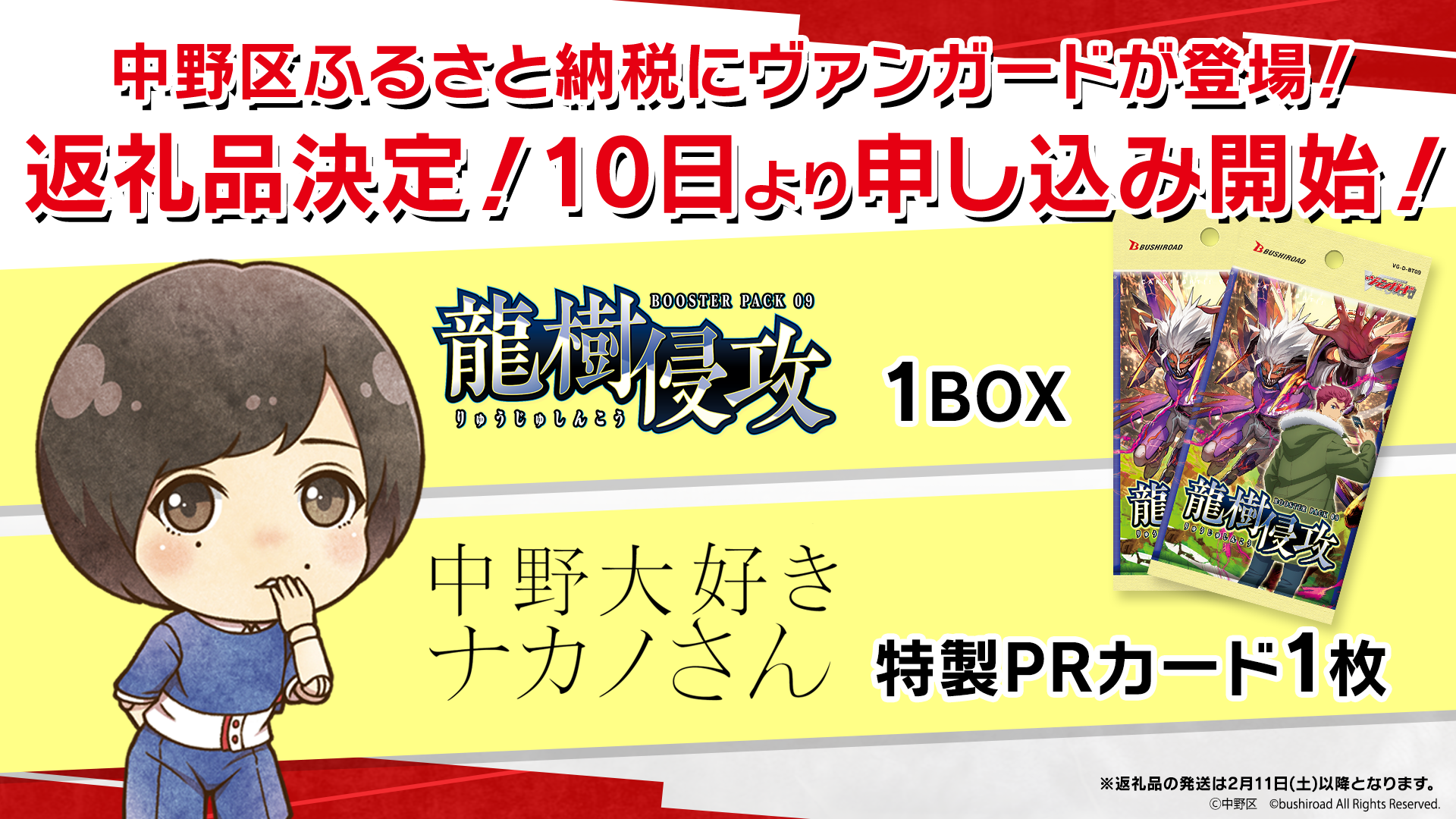 株式会社ブシロード(本社:東京都中野区、代表取締役社長:木谷高明)は、1月10日(火)にカードファイト!! ヴァンガードが中野区ふるさと納税の返礼品に登場することをお知らせいたします。