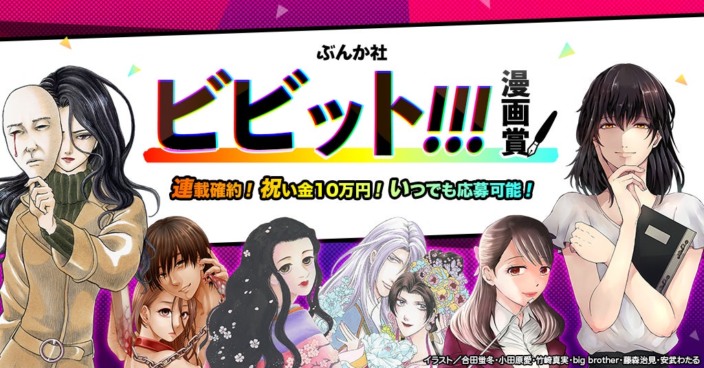 株式会社ぶんか社(本社:東京都千代田区、代表取締役:櫻井祐一)は、電子コミック誌「ストーリーな女たち」「comic RiSky」「COMIC ヤミツキ」などでの連載権をかけた『ビビット!!! 漫画賞』を創設。次世代の才能を発掘するべく、プロ・アマを問わず多くの作家さんの作品を募集いたします。