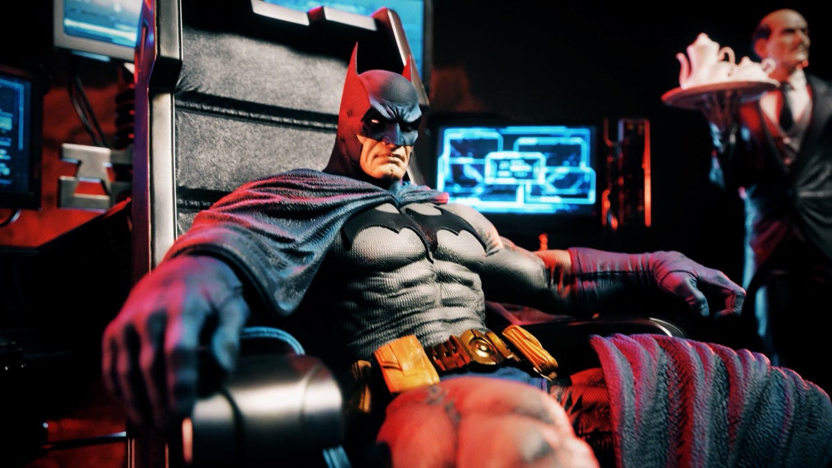バットケイブの玉座に座るバットマンと傍らに控えるアルフレッド。11月公開の『NEXT LEVEL SHOWCASE Part 1』、そして東京コミコン2022の会場でも話題になったこの「バットマンタクティカルスローン」も新宿初登場です。