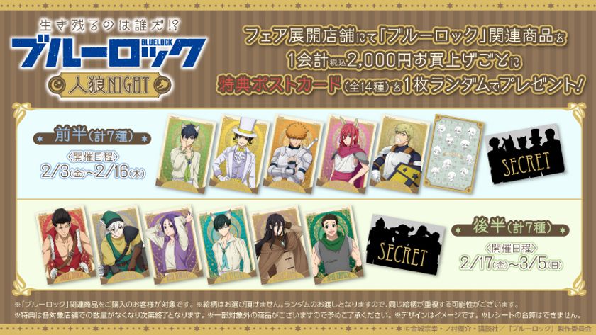 フェア展開店舗にて「ブルーロック」関連商品を1会計税込2,000円お買い上げごとに「ポストカード」を1枚ランダムでプレゼントいたします。