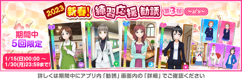 株式会社ブシロード(本社:東京都中野区、代表取締役社長:木谷高明)は、KLab株式会社(本社:東京都港区、代表取締役社長:森田英克)と共同開発いたしましたスマートフォン向けアプリ『ラブライブ!スクールアイドルフェスティバル』(以下、スクフェス) において2023スクフェスニューイヤーキャンペーン第4弾の開催をお知らせいたします。