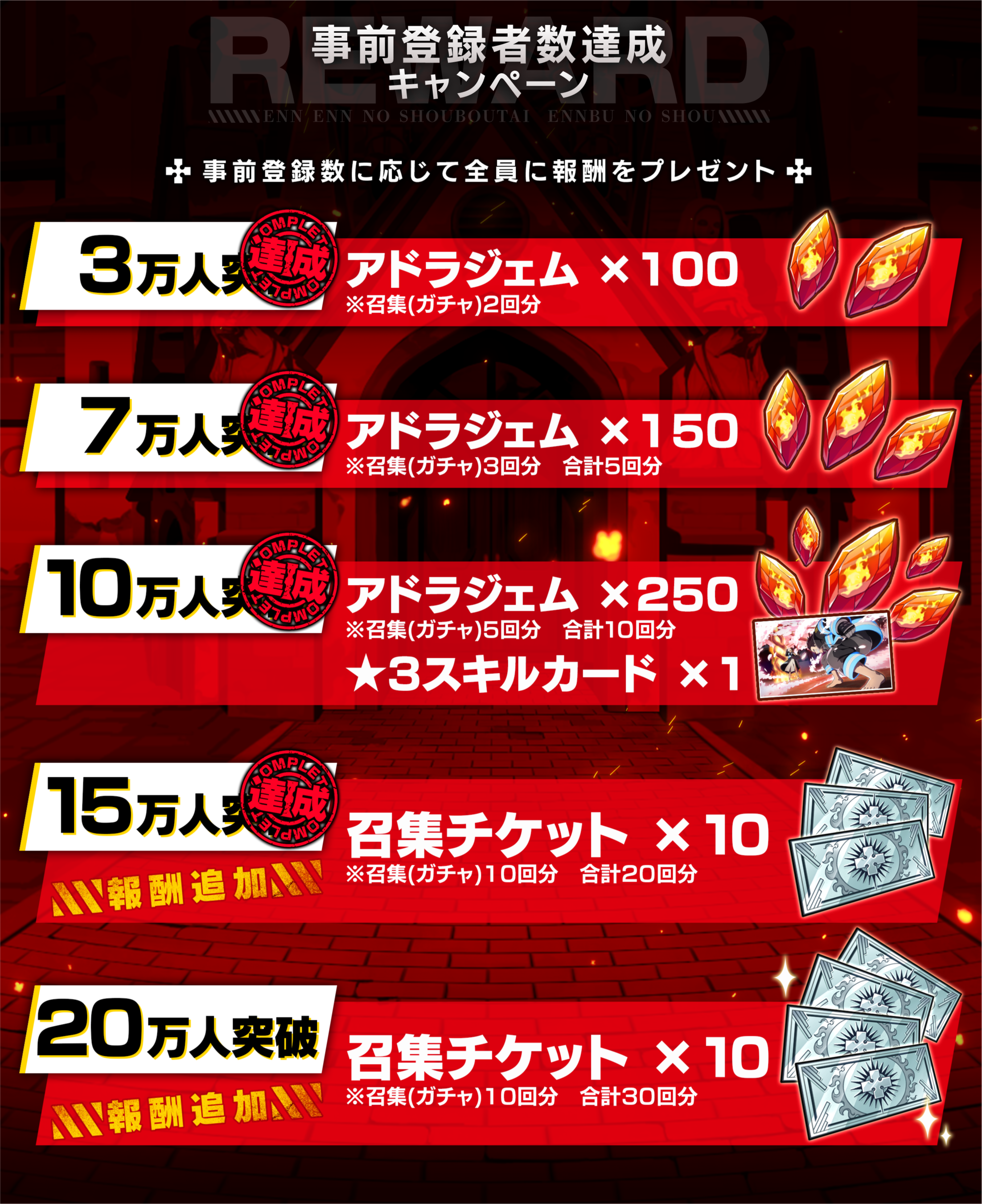 ・10万人 アドラジェム×250 ★3スキルカード×1 ※召集(ガチャ)5回分 合計10回分達成!