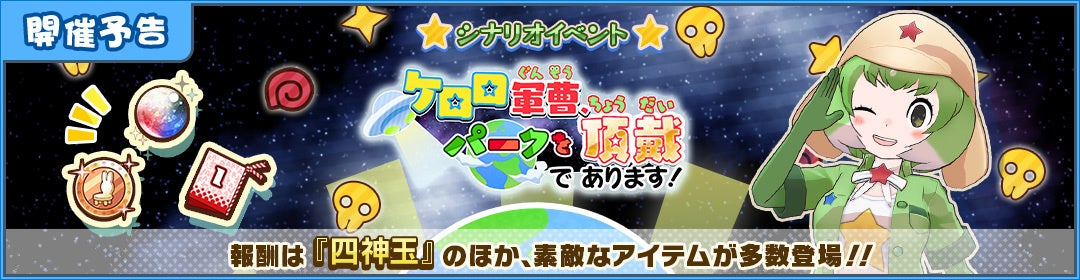 シナリオイベント「ケロロ軍曹、パークを頂戴であります!」では、本コラボ限定の特別なストーリーをお楽しみいただけます。