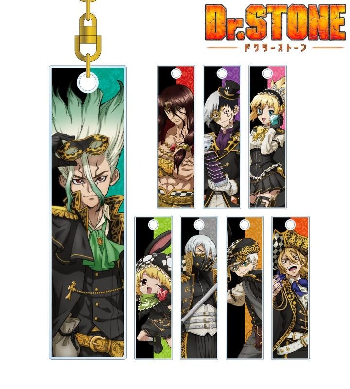 怪盗団の衣装を身に纏った石神千空、獅子王司、あさぎりゲン、コハク、スイカ、氷月、西園寺羽京、七海龍水を描き下ろしイラスト商品に仕上げました。