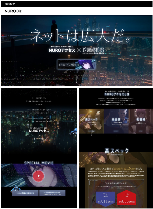 本企画の実施にあたり、「NURO Biz」公式サイトと「NUROアクセス」公式LPが「攻殻機動隊 SAC_2045」コラボ仕様に変更となります。さらに、コラボムービーの公開、攻殻機動隊グッズのプレゼントキャンペーンなど、盛りだくさんの内容となっております。