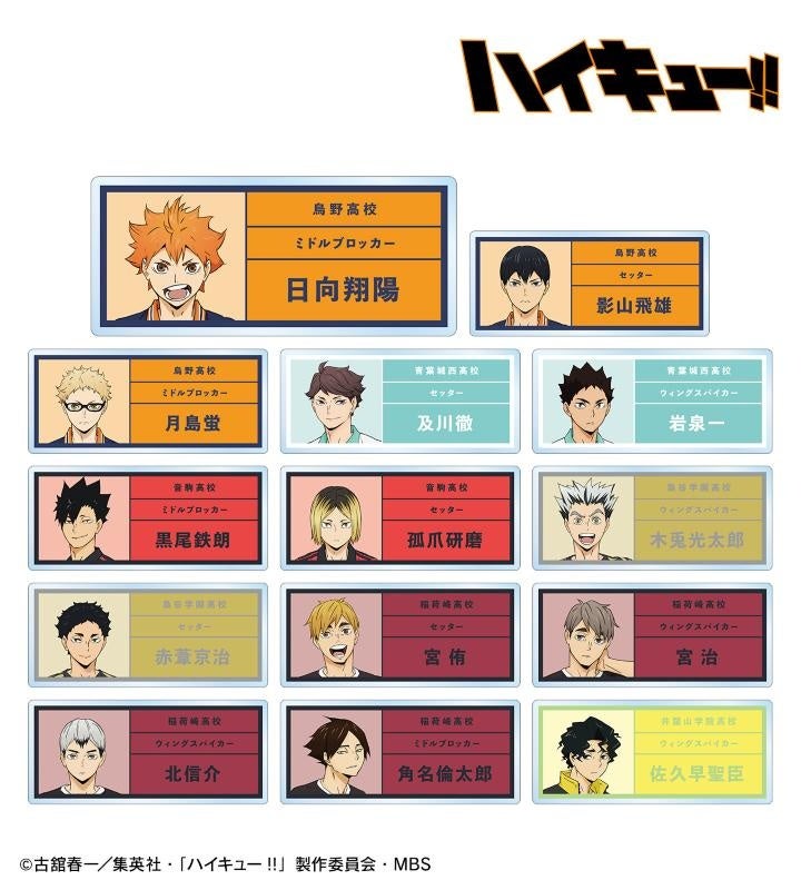 種類 :全14種(日向翔陽、影山飛雄、月島蛍、及川徹、岩泉一、黒尾鉄朗、孤爪研磨、木兎光太郎、赤葦京治、宮侑、宮治、北信介、角名倫太郎、佐久早聖臣)