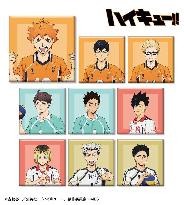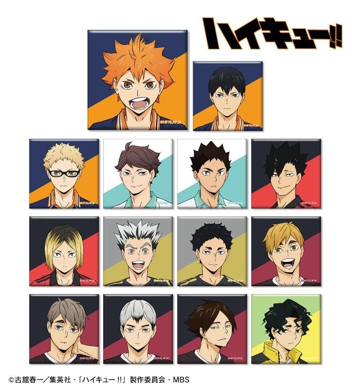 日向翔陽、影山飛雄、月島蛍、及川徹、岩泉一、黒尾鉄朗、孤爪研磨、木兎光太郎、赤葦京治、宮侑、宮治、北信介、角名倫太郎、佐久早聖臣をスクエア缶バッジに仕上げました。