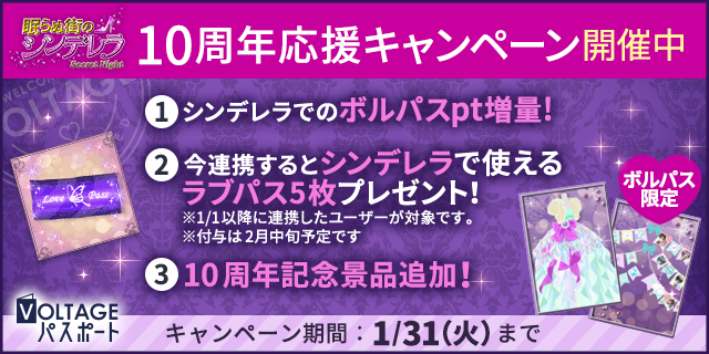 株式会社ボルテージ(本社:東京都渋谷区 代表取締役:津谷 祐司)は、提供中のボル恋タイトル「眠らぬ街のシンデレラ Secret Night」が1月17日(火)に配信10周年を迎えたことをお知らせいたします。
