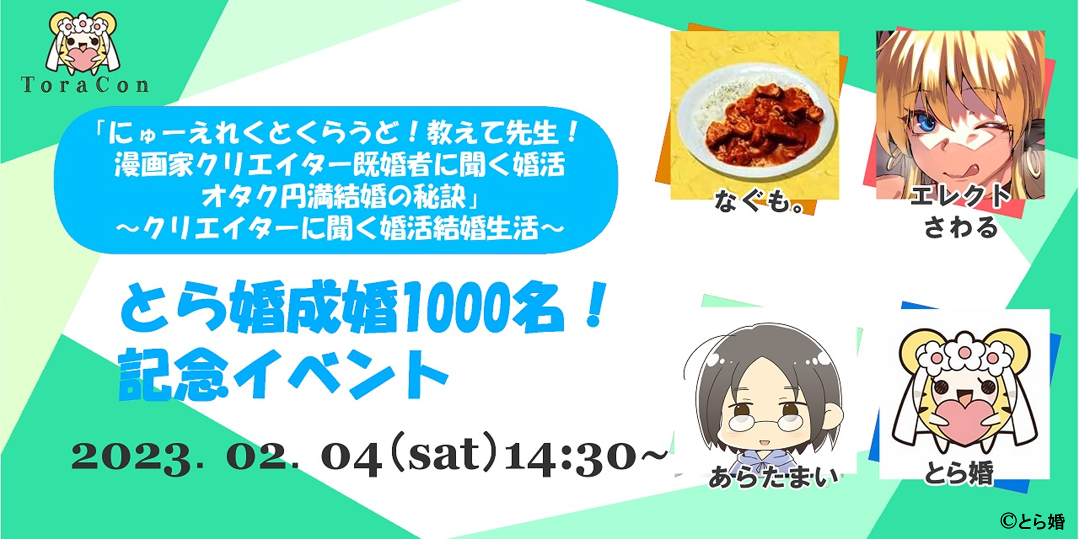 アニメや漫画・ゲームなど趣味を愛するオタク層向けに特化した結婚相談サービス「とら婚」は、現役の漫画家をゲストに招き、成婚数1,000名突破記念の「クリエイター既婚者に聞く婚活トークイベント」を、2023年2月4日(土)に開催いたします。