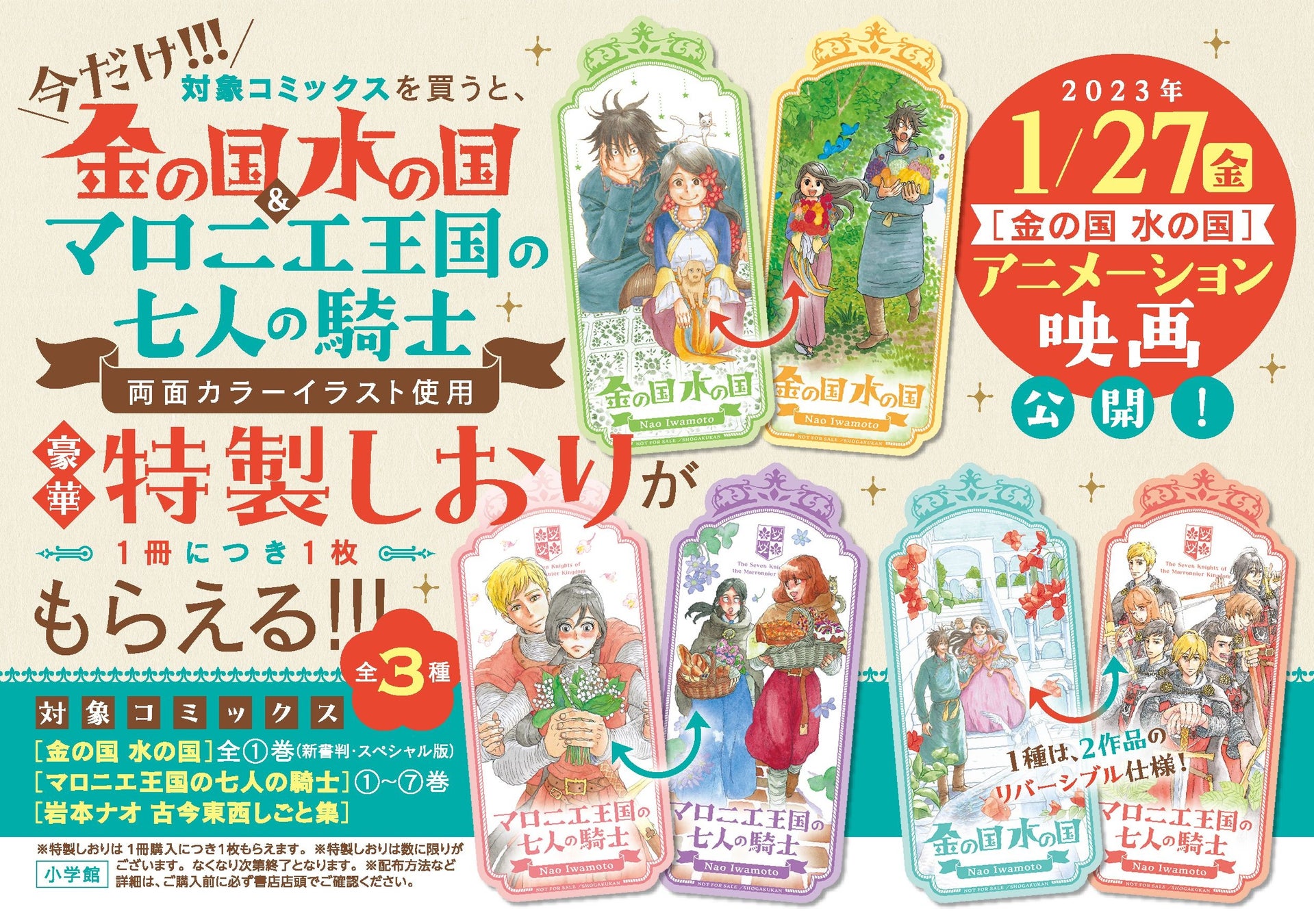 対象コミックスを購入すると、豪華特製しおり(全3種)がもらえるフェアを全国のフェア対象書店で1月19日より順次スタートします! 「このマンガがすごい!」オンナ編(宝島社)で2年連続1位になった『金の国 水の国』と『マロニエ王国の七人の騎士』のイラストを使用したコンプリート必至のしおりです。 全3種のうち、なんと1種は2作品のリバーシブル仕様! ぜひこの機会にゲットしてみてください!