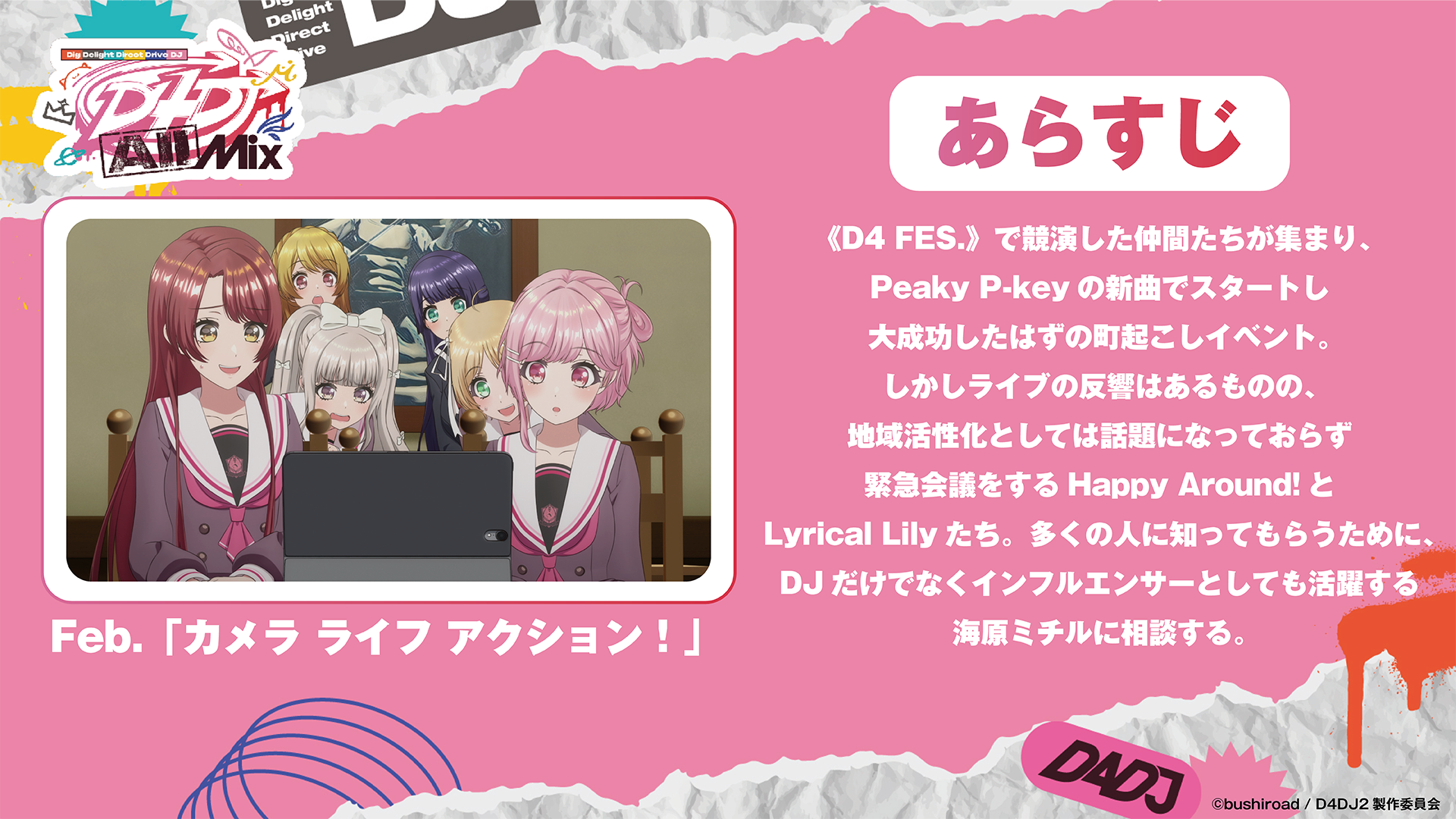 株式会社ブシロード(本社:東京都中野区、代表取締役社長:木谷高明)は、1月20日(金)23時よりTOKYO MX、BS日テレほかにて放送のTVアニメ「D4DJ All Mix」第2話あらすじと先行場面カットの公開をしたことをご案内いたします。