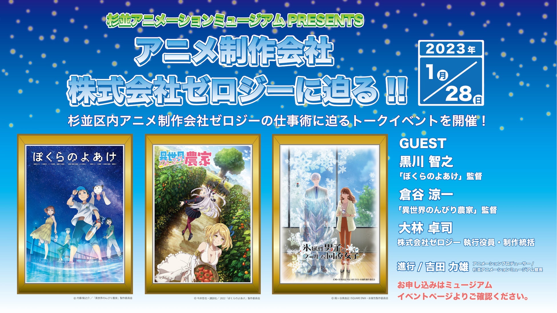 当館が所在する杉並区は、国内で一番多くのアニメ制作会社が集まる地域です。この特性を多くの方々に知って頂く機会として、区内に本社を構える「株式会社ゼロジー」からゲストをお迎えするトークイベントを開催致します。