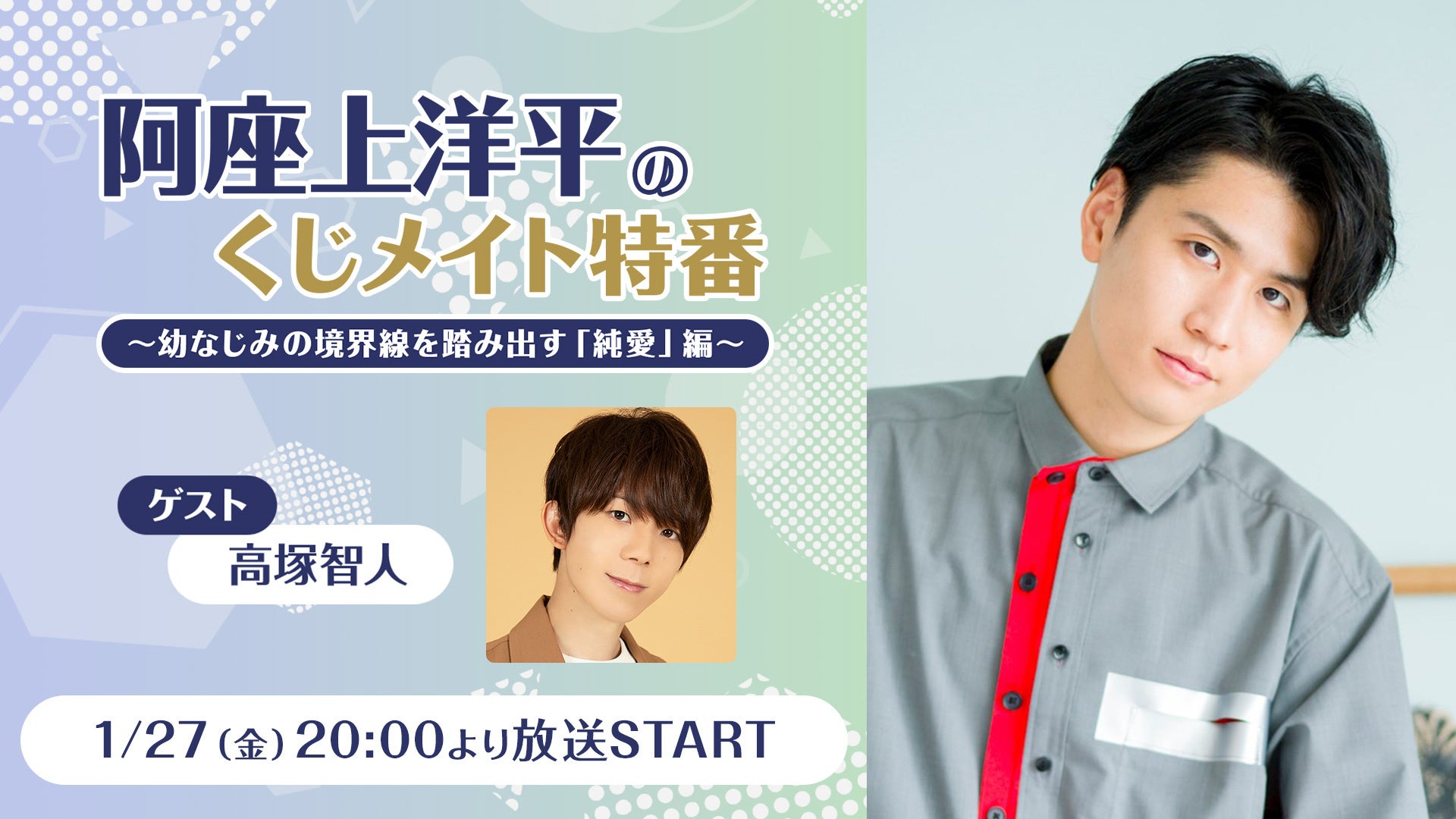 1月27日(金)放送の「阿座上洋平のくじメイト特番~幼なじみの境界線を踏み出す「純愛」編~」は、アニメイトのオンラインくじサービス「くじメイト」において、阿座上洋平さんのくじメイトが発売されたことを記念して行われる特別番組です。