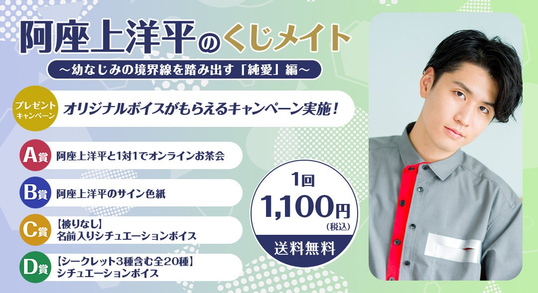 1月20日(金)より販売開始の「阿座上洋平のくじメイト~幼なじみの境界線を踏み出す「純愛」編~」は、アニメイト通販内で購入できるはずれなしのオンラインくじサービスです。