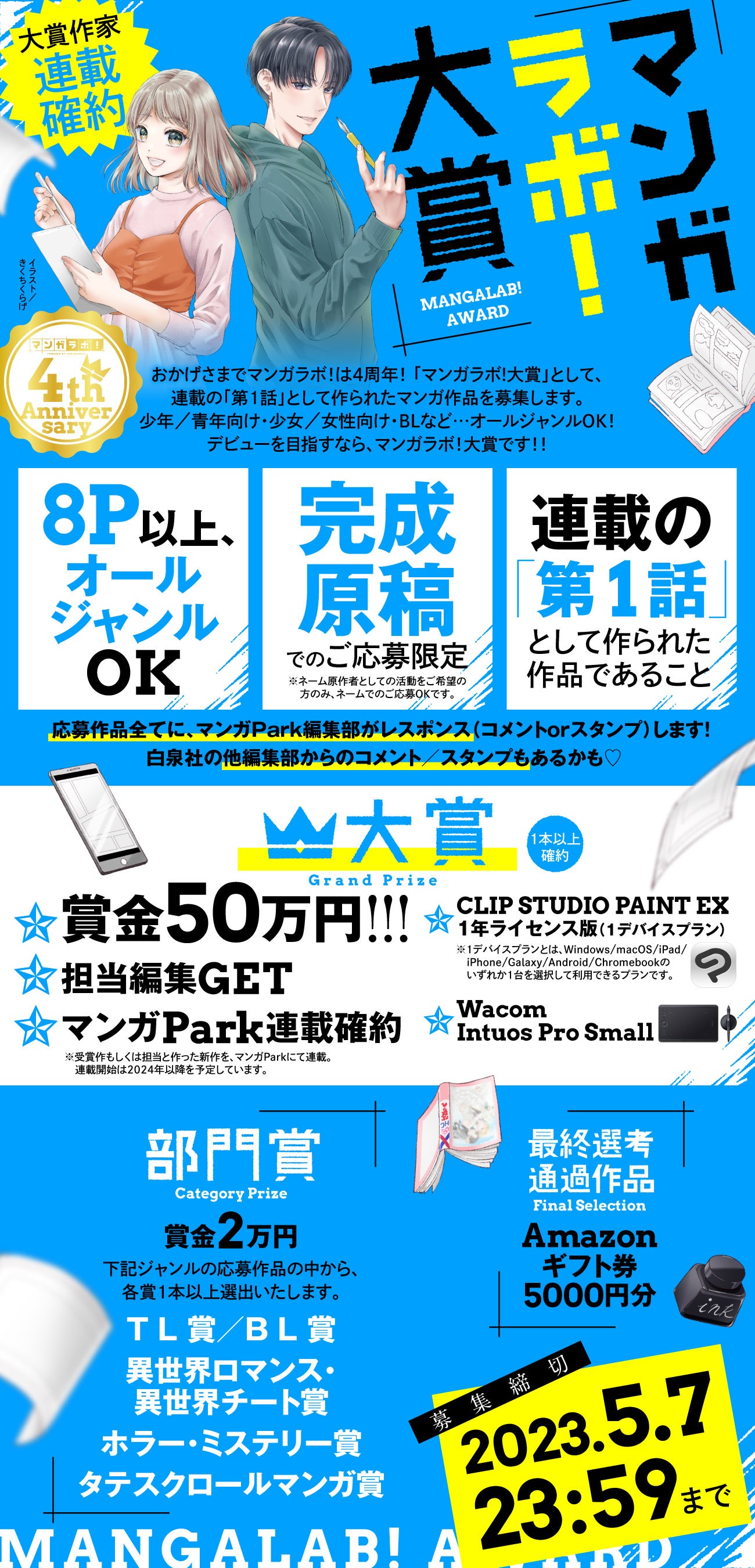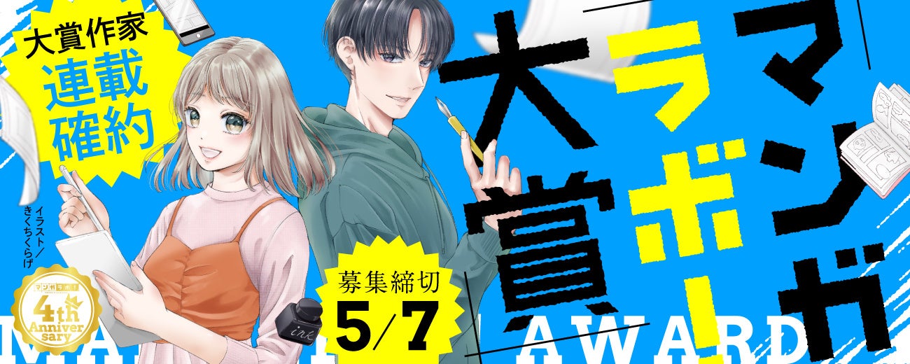 おかげさまで「マンガラボ!」は4周年を迎えます。「マンガラボ!大賞」として、連載の「第1話」として作られたマンガ作品を募集いたします。少年/青年向け・少女/女性向け・BLなど…オールジャンルOK! デビューを目指すなら、「マンガラボ!大賞です」!!