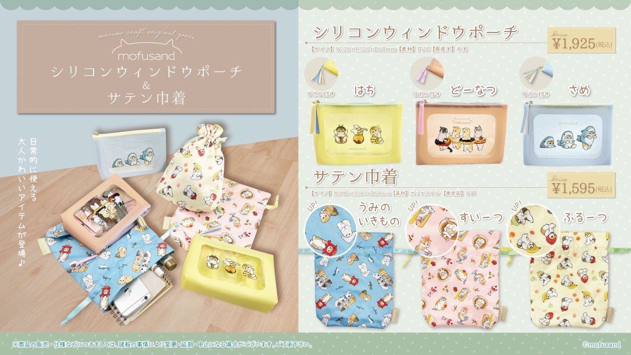 株式会社マリモクラフト(本社:東京都江戸川区 代表取締役社長:酒井 修)は、「mofusand」の猫たちがデザインされたシリコンウィンドウポーチとサテン巾着を1月上旬より発売いたします。