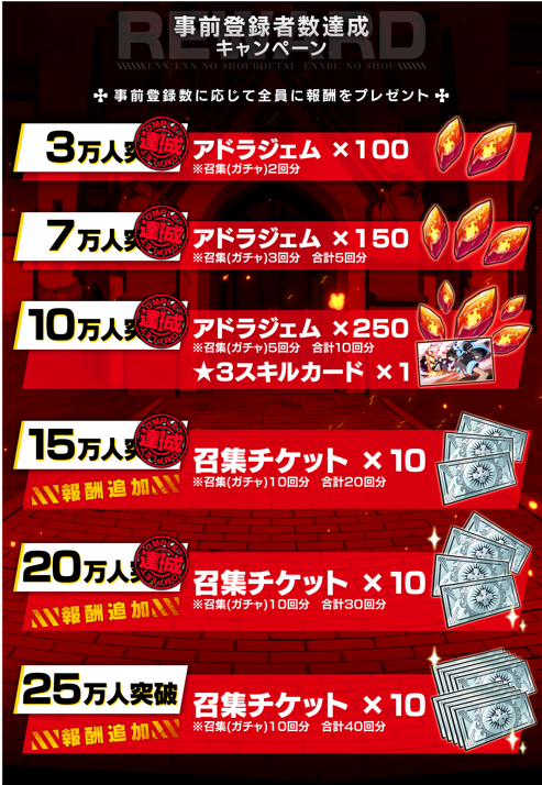 - 事前登録特典:25万人突破における報酬を追加!
