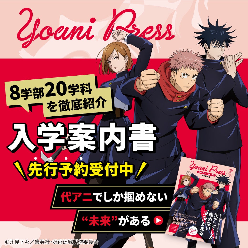 創立45周年を迎える本年は、TVアニメ「呪術廻戦」とのコラボでスタート!2024年度入学者向けの入学案内書は、「呪術廻戦」の人気キャラクターがデザインされた特別なコラボ表紙になっており、本日より予約受付を開始します。また、実際のアニメ映像を用いてのアフレコなどの授業を体験できる「コラボオープンキャンパス」を、3月よりスタート予定です。初心者の方へもしっかりとアドバイスを行いますので、たくさんの方のご参加をお待ちしています。