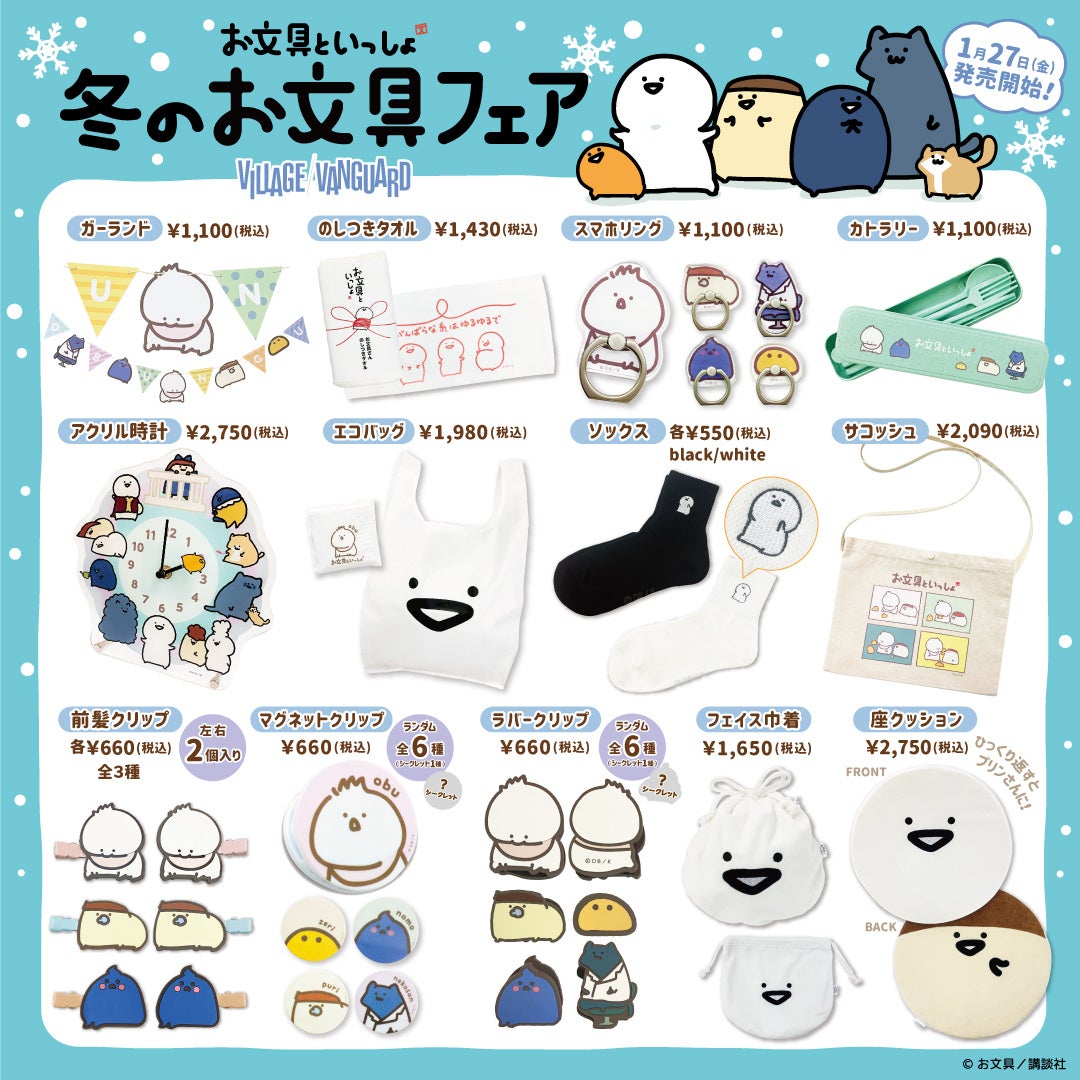 株式会社ヴィレッジヴァンガードコーポレーション(所在地:愛知県名古屋市、代表取締役社長:白川篤典)では、「お文具といっしょ」のグッズを集めた『冬のお文具フェア』の開催を決定いたしました。ヴィレッジヴァンガード店舗では2023年1月27日(金)より販売を開始し、オンラインストアでは2023年1月20日(金)より先行受注を開始いたします。