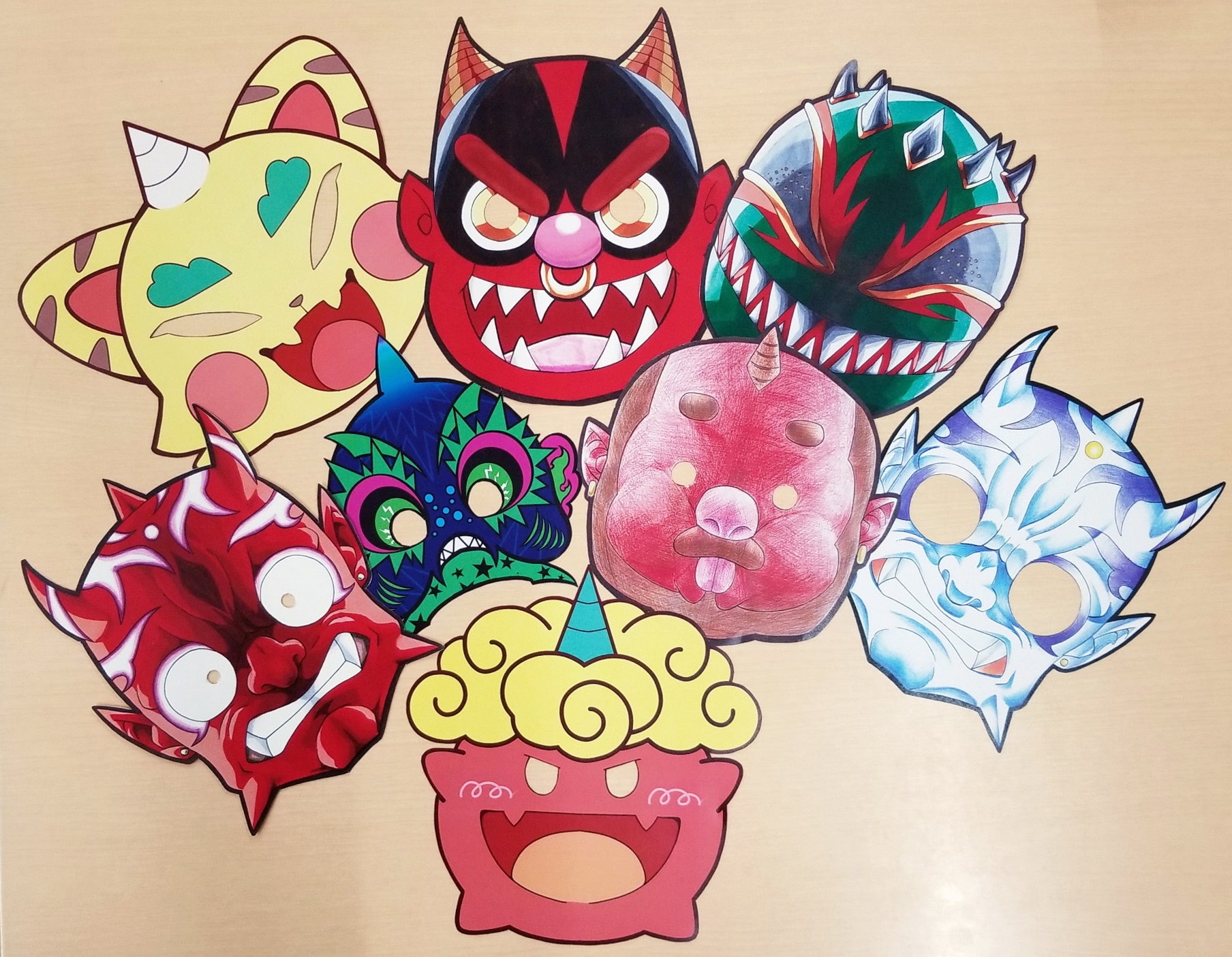 参加される方には各種お面の素材を好きなように着色していただく、のみです!お子様から大人の方までお楽しみいただけます!完成した作品は、ご自宅での豆まきにもご活用ください!