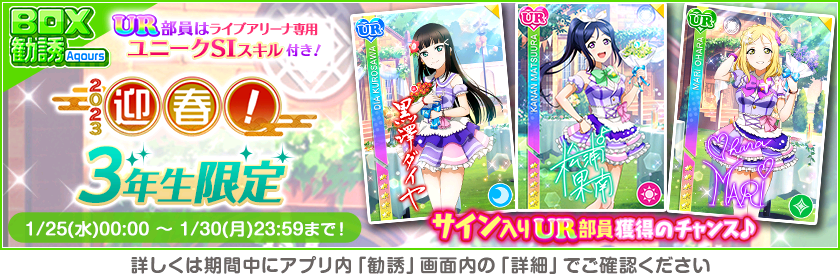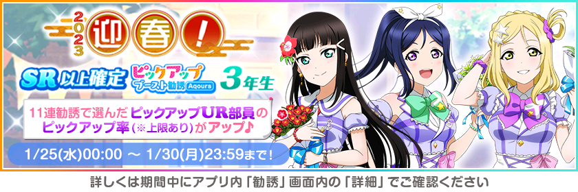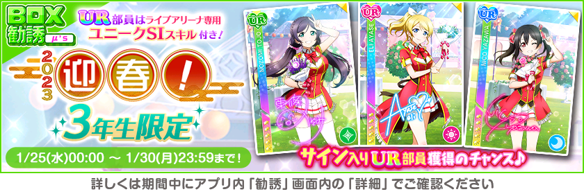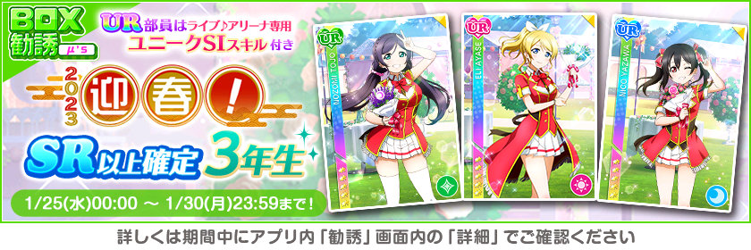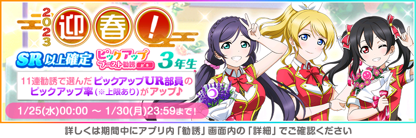 株式会社ブシロード(本社:東京都中野区、代表取締役社長:木谷高明)は、KLab株式会社(本社:東京都港区、代表取締役社長:森田英克)と共同開発いたしましたスマートフォン向けアプリ『ラブライブ!スクールアイドルフェスティバル』(以下、スクフェス) において2023スクフェスニューイヤーキャンペーン第6弾の開催をお知らせいたします。