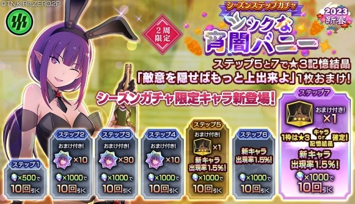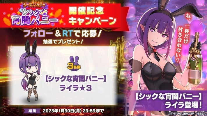 株式会社セガは、配信中の人気テレビアニメ「Re:ゼロから始める異世界生活」公式スマートフォン向けゲーム『Re:ゼロから始める異世界生活Lost in Memories(以下、『リゼロス』)』にて、本日2023年1月24日(火)より、「【シックな宵闇バニー】ライラ」の出現率がUPする「シーズンガチャ【シックな宵闇バニー】」を開催します。