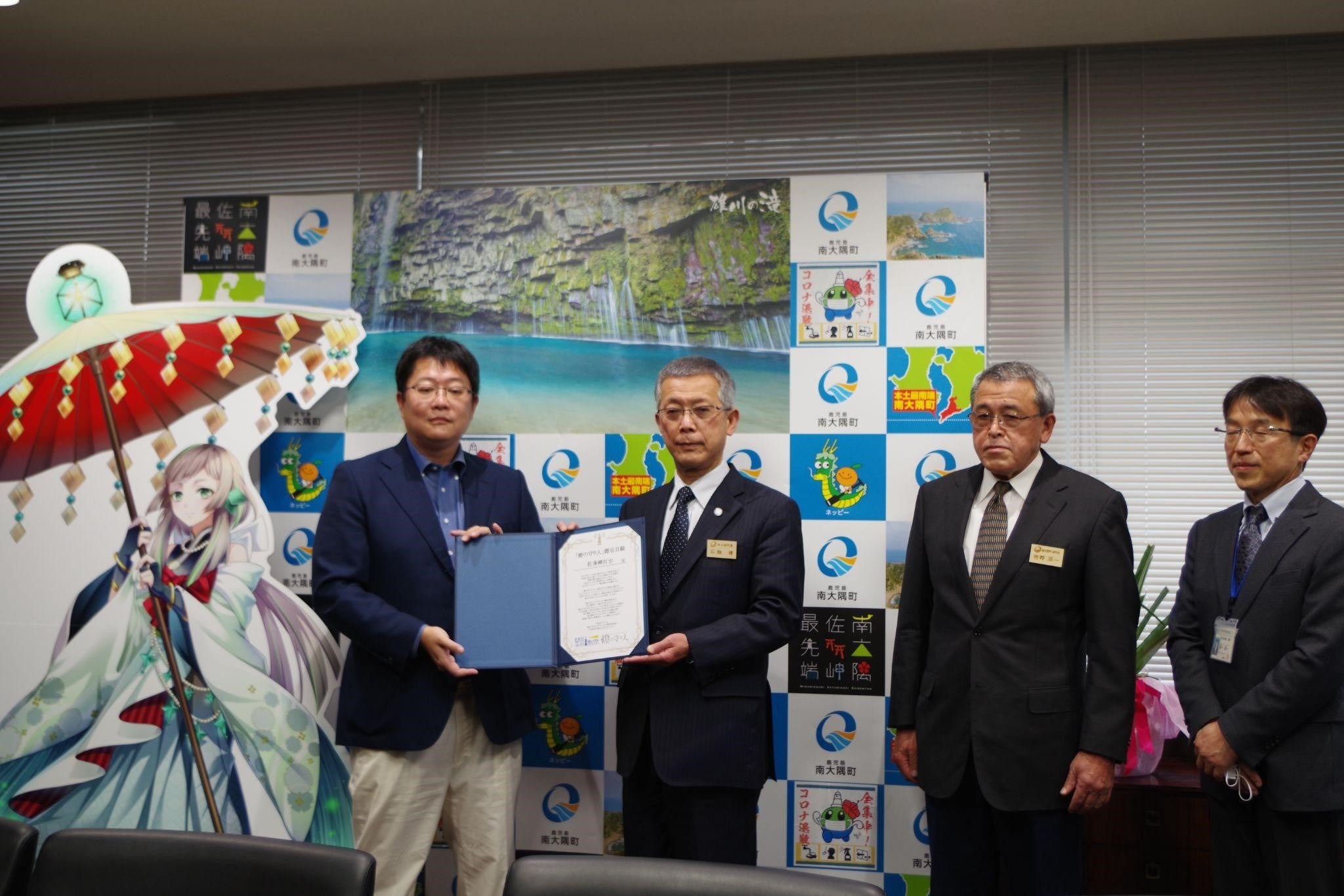 燈の守り人キャラクターを活用して、地域の灯台を歴史・文化資産として活用する機運をつくるため、キャラクター化の対象となる「佐多岬灯台」が立地している鹿児島県南大隅町の石畑博町長を、「燈の守り人」製作委員会プロデューサーの柴田英知が2023年1月19日(木)に表敬訪問し、キャラクターの贈呈式を実施しました。