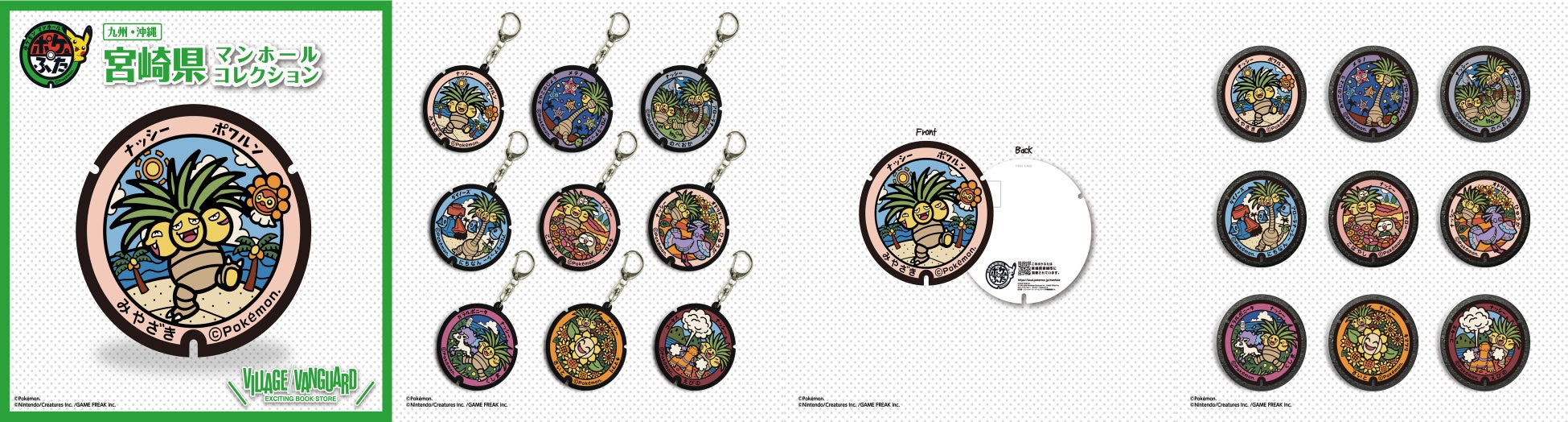 県内の26市町村全てに設置されている「ポケふた」。そのうちの9種からいずれか1点が当たります。4等は「ラバーキーホルダー」、5等は「ポストカード&缶バッジ」のセットです。これらの商品はヴィレッジヴァンガードで販売中です。