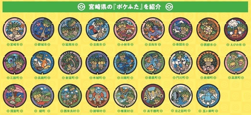 ポケモンの絵が描かれたマンホール蓋で、全国各地に設置されています。全国・全世界の多くの方に、地域の魅力とポケモンたちの魅力を知ってもらうことを目指しており、宮崎県は、県内の26市町村全てに設置されています。