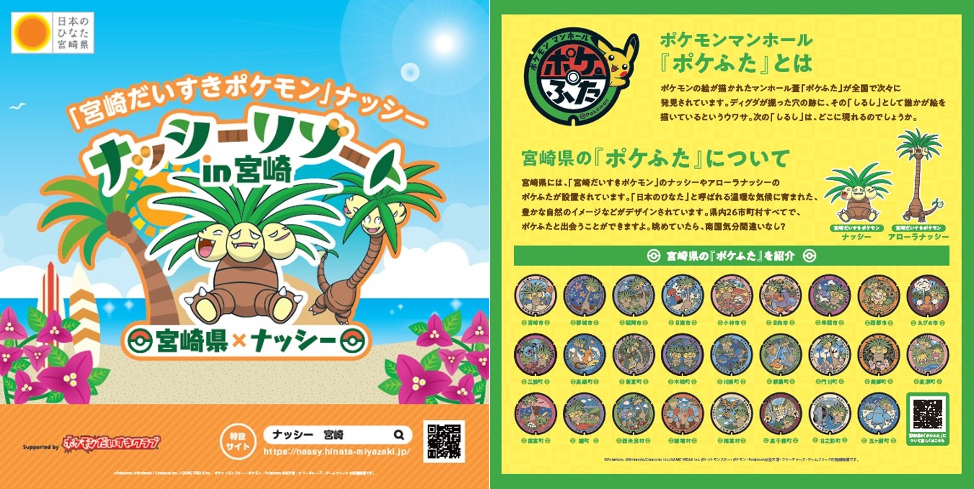 2020年10月、ナッシーとアローラナッシーは「宮崎だいすきポケモン」に任命されました。 宮崎県の県の木には、ヤシ科の「フェニックス」が制定されており、ヤシの木のような見た目で、「歩く熱帯雨林」と呼ばれるナッシーは、宮崎県のイメージにピッタリです。温暖な気候で一年中温かく、「日本のひなた」とも呼ばれる宮崎県と相性バツグンのナッシーが、さまざまな取組で宮崎県を盛り上げていきます。