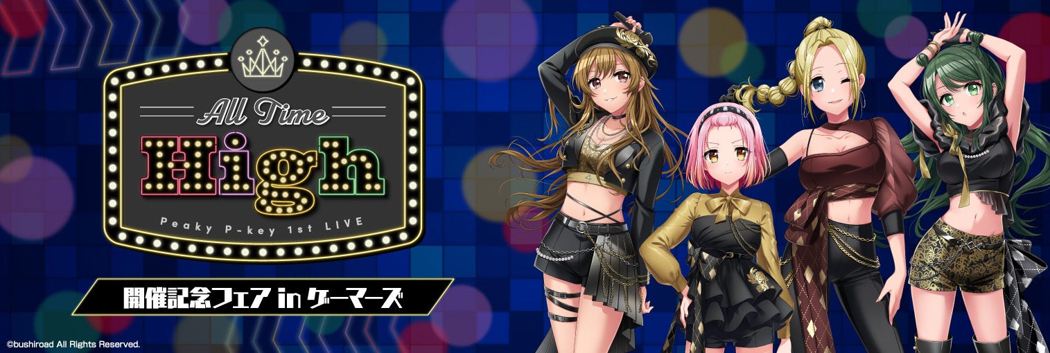 株式会社ブシロード(本社:東京都中野区、代表取締役社長:木谷高明)のグループ会社にあたる株式会社ブシロードクリエイティブ(本社:東京都中野区、代表取締役社⻑:成⽥耕祐)は、全国のゲーマーズ店舗とゲーマーズオンラインショップにて、「Peaky P-key 1st LIVE「All Time High」 開催記念フェア in ゲーマーズ」の期間限定フェアを開催いたします。