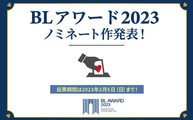 本年2023年の発表で14回目を迎える「BLアワード」は、発表前年の1年間に発売された商業BL作品の中から、最も輝いていたと思う「コミック」「小説」「CD」「声優」をBLファンに選んでいただき、投票によってBLの最高峰を決定する最大級の商業BLランキング企画です。結果は2023年3月31日(金)、「ちるちる」にて発表いたします。