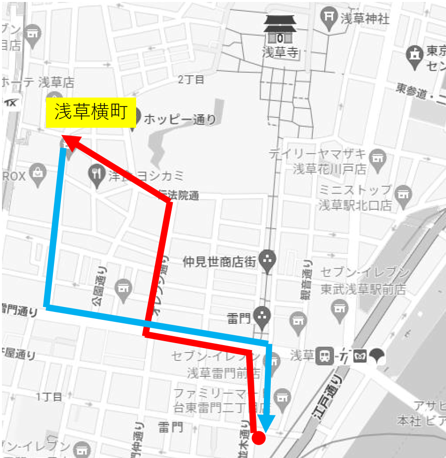 ・Aルート/「時代屋明治館」前 発→オレンジ通り→伝法院通り→六区通り→セントラルスクエア(浅草横町前) 行
