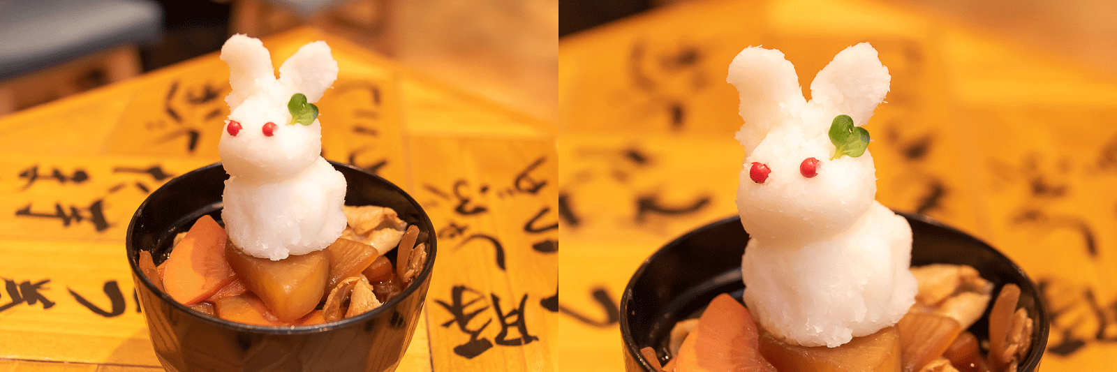 大根おろしで作られた可愛らしいうさぎが、雪だるまを模した形でトッピングされた豚汁です。大根、ごぼう、人参など具だくさんな一品で、小腹が空いた時にもピッタリ。口当たりのよい野菜の出汁が、優しく染み渡るこだわりのメニューとなっています。