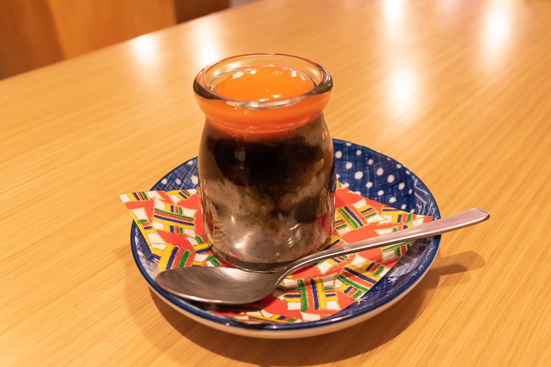 黒ゴマプリンに、生卵を乗せてお月見をイメージした一品。生卵とプリンの間には、黒蜜が隠れており、絡めて食べるとまた違った楽しみ方も。ゴマの風味が豊かでスッキリとした味わい、卵のコクとまろやかさ、濃厚な黒蜜の甘みなど、すべての調和が取れた上品なスイーツをぜひご堪能ください。