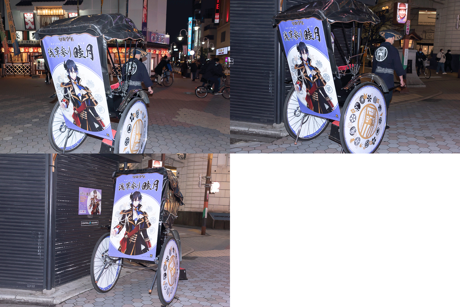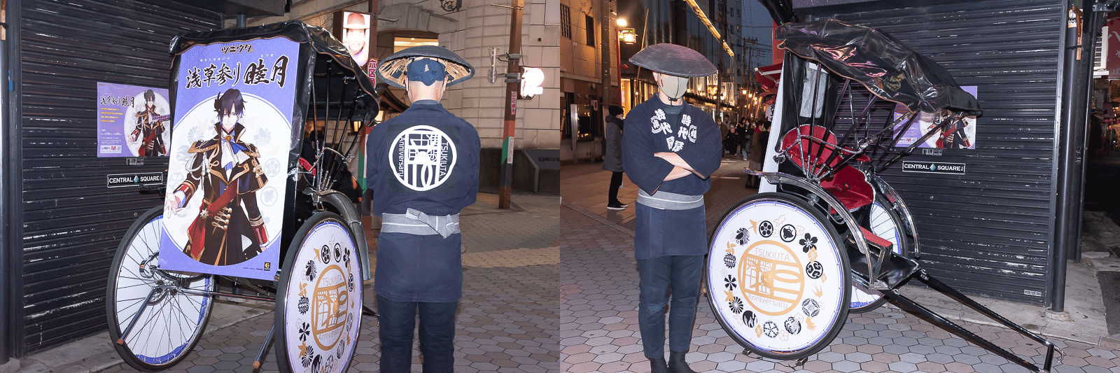 オリジナルラッピングが施された人力車が浅草の街を運行中です。車体は、睦月 始のラッピング、車輪には各キャラクターの家紋プリントが施されており、10周年記念の特別仕様となっています。