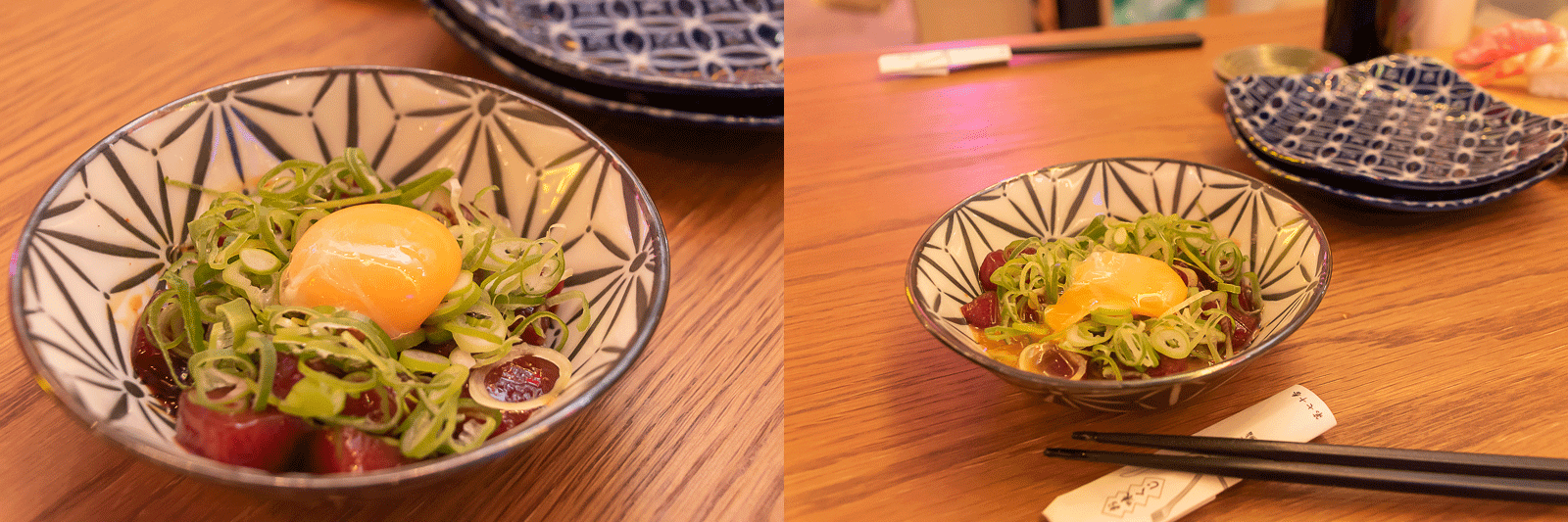浅草すしでは、人気メニューである「マグロのユッケ」がコラボ仕様に。マグロの旨味に加え、コチュジャンが使用されたピリ辛なユッケダレ、イカスミソースがマッチしたコクのある風味豊かな一品。卵の黄身を崩せば、まろやかさも口いっぱいに広がります。