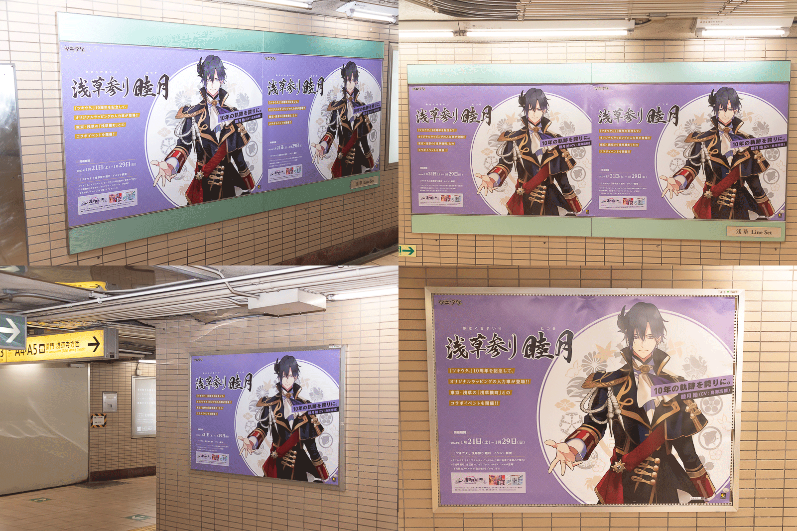 浅草駅では、1月23日(月)より睦月 始の姿が描かれた駅広告が掲載中。銀座線浅草駅(松屋・隅田公園改札外7番出口方面通路)、都営浅草線浅草駅(雷門方面改札外A4.5番出口方面通路)にて掲載されていますので、浅草にお立ち寄りの際は、ご覧になってはいかがでしょうか。