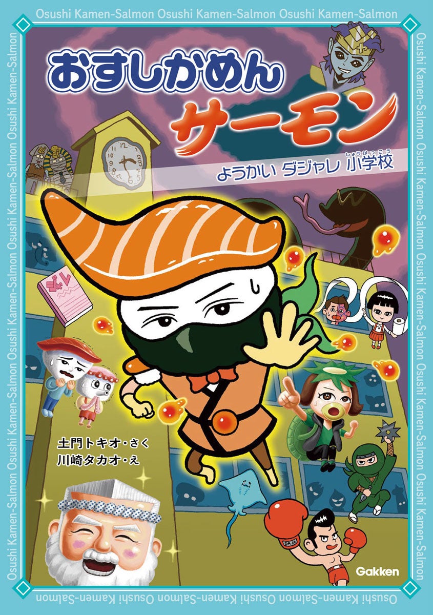 なぞなぞや迷路、パズルなどのさまざまな遊びをモチーフにした低学年向け読み物シリーズ。主人公の気弱な小学生スシオが「ハイパーワサビ」を頭に塗ることで、おすしがモチーフのヒーロー「おすしかめんサーモン」に変身。「イクラフラッシュ」などの個性的な技を使っておばけや妖怪たちとたたかう姿はもちろん、とつぜん出てくるシュールなギャグなど親子で楽しめる作品です。