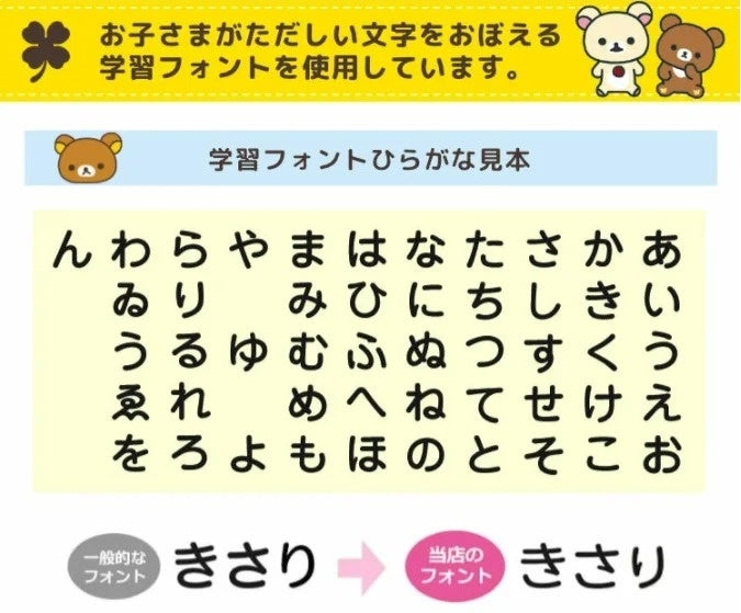 まだ文字を読めないお子さまにも、かわいいリラックマのイラストで自分のものがわかるメリットがありますが、お名前部分もお子さまの学びに配慮した学習フォントを採用。たとえばひらがなの「き」「さ」「り」のように間違った書き方をされやすい文字について、正しい書き方を覚えることに役立ちます。