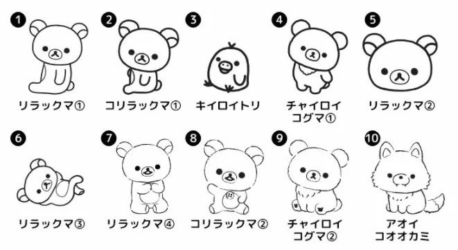 リラックマはもちろん、キイロイトリ、コリラックマ、チャイロイコグマ、さらにチャイロイコグマのお友だちのアオイコオオカミまで、イラストはぜんぶで10種類から選べます。