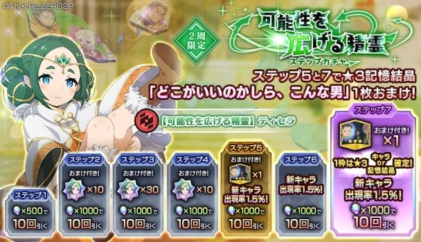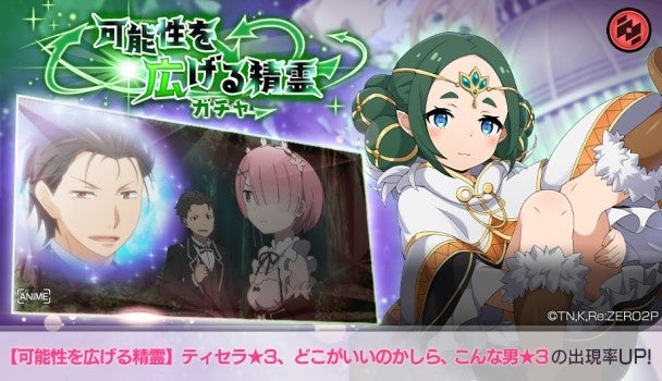 また、ストーリーイベント「ドキドキ遊園地デート!!」の特効を持った新キャラクター「【絶叫コースター】ラム★3」「【至福の観覧車】レム★3」が新登場する「ラムレム生誕祭バースデーアニバーサリーガチャ」と、「【可能性を広げる精霊】ティセラ★3」が新登場する「【可能性を広げる精霊】ガチャ」を同時開催します。