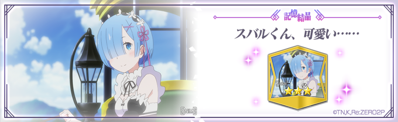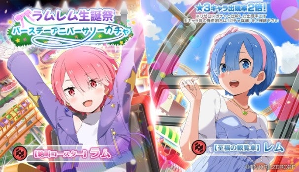 内容:ストーリーイベント「ドキドキ遊園地デート!!」の特効を持ったキャラクター「【絶叫コースター】ラム★3」「【至福の観覧車】レム★3」、記憶結晶「ちゃんと視てるから★3」「スバルくん、可愛い……★3」の出現率がUPする「ラムレム生誕祭バースデーアニバーサリーガチャ」を開催します。