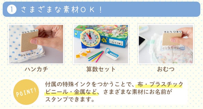 こちらはおむつや肌着やくつした、コップやお弁当箱、クレヨンやえんぴつ、お道具袋やノートといった、サイズの異なるさまざまな持ち物にスタンプできる大小8個のお名前スタンプ。小学校高学年まで使える漢字スタンプ2個つきで、使う場面の多いオーソドックスなサイズを選びました。