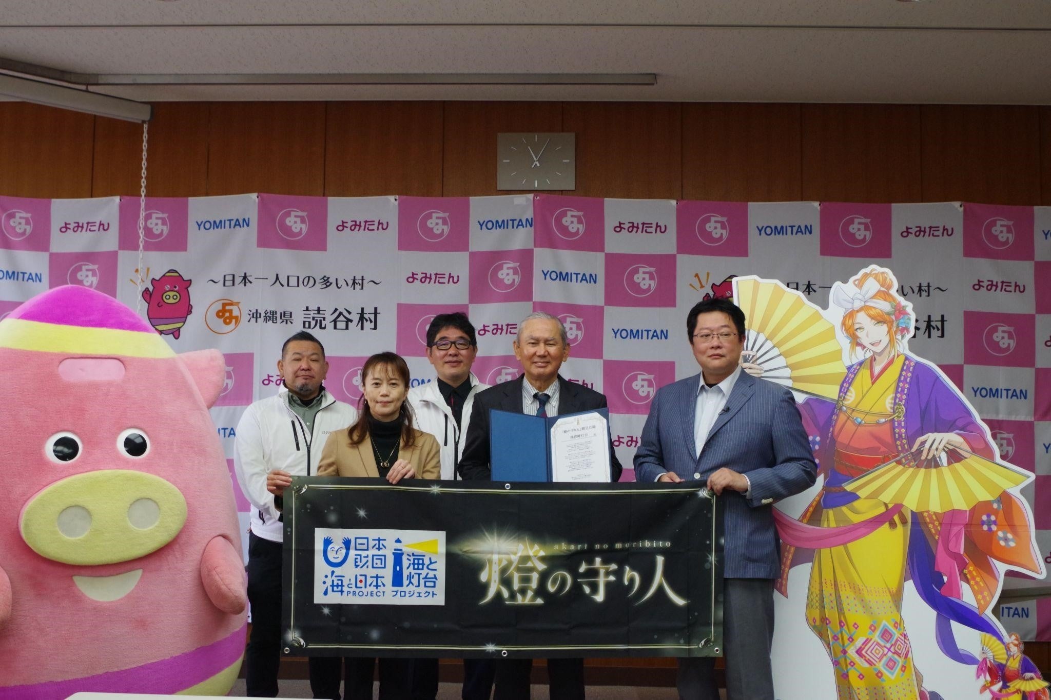 燈の守り人キャラクターを活用して、地域の灯台を歴史・文化資産として活用する機運をつくるため、キャラクター化の対象となる「残波岬灯台」が立地している沖縄県読谷村の石嶺傳實村長を、「燈の守り人」製作委員会プロデューサーの柴田英知が2023年1月30日(月)に表敬訪問し、キャラクターの贈呈式を実施しました。