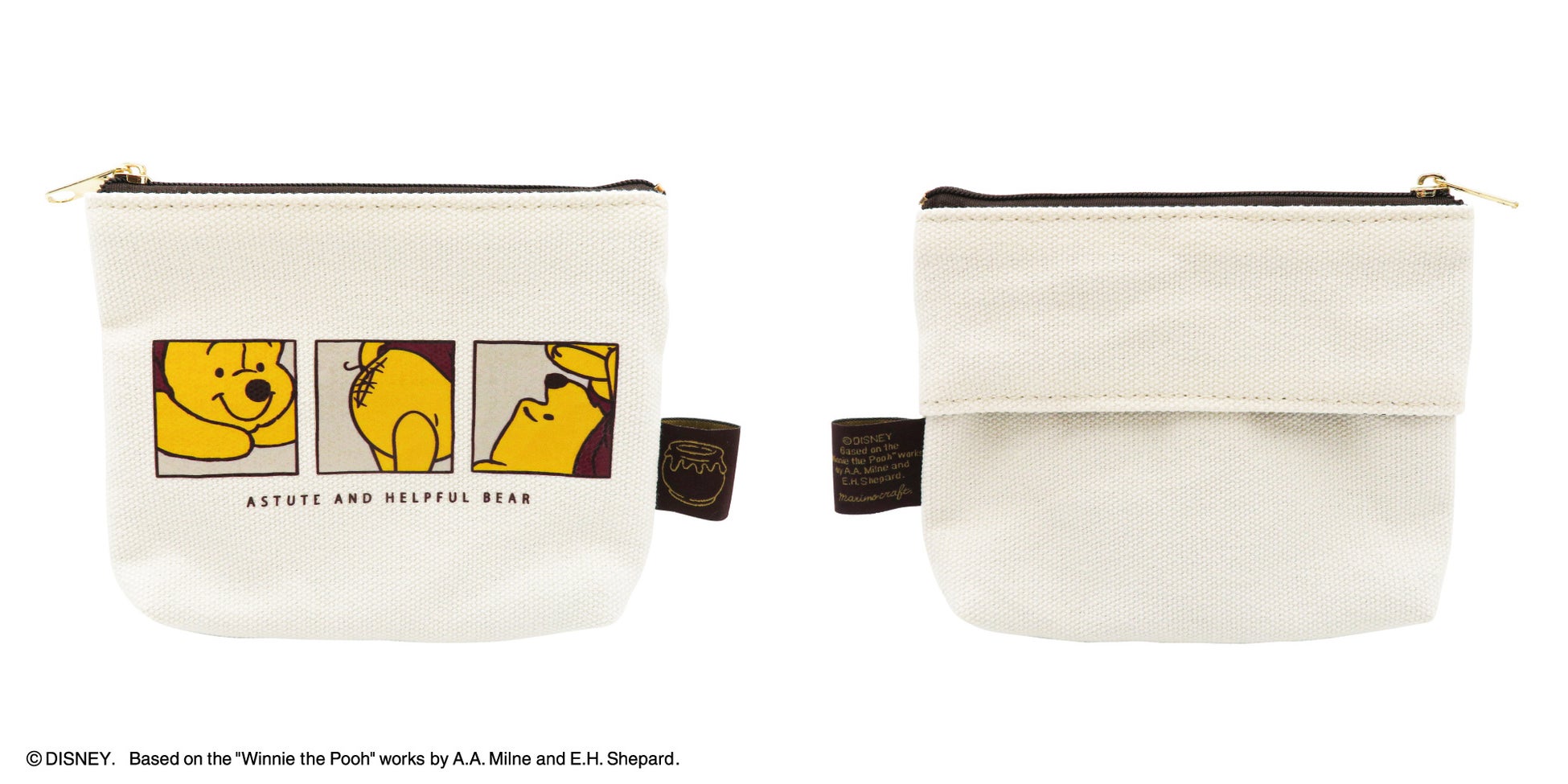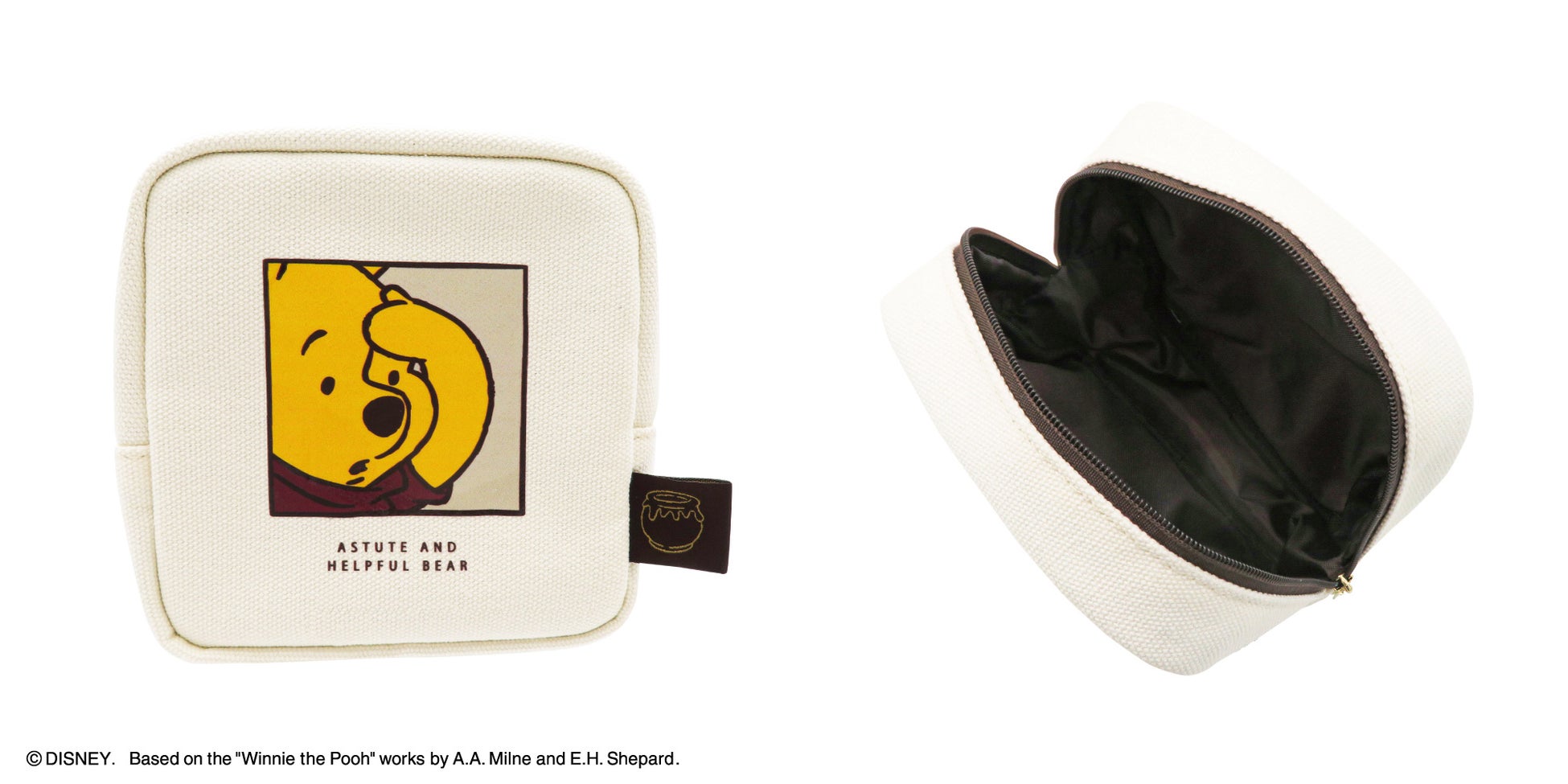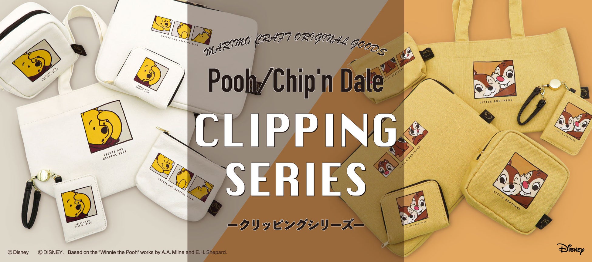 「くまのプーさん」と「チップ&デール」の正方形イラストを使用したクリッピングシリーズが登場します。「くまのプーさん」はホワイトのキャンバス地に、プーさんのとぼけた顔と身振りがチャーミングなイラストをプリントしました。「チップ&デール」はイエローのキャンバス地に、ピッタリ寄り添うチップとデールが可愛いイラストがアクセントになっています。どちらも甘すぎないデザインでカジュアルにお使いいただけます。商品ラインナップは、普段使いしやすいミニトート、ティッシュポーチ、タブレットポーチ、スクエアポーチ、コインケース、オープンパスケースの全6アイテムを展開します。