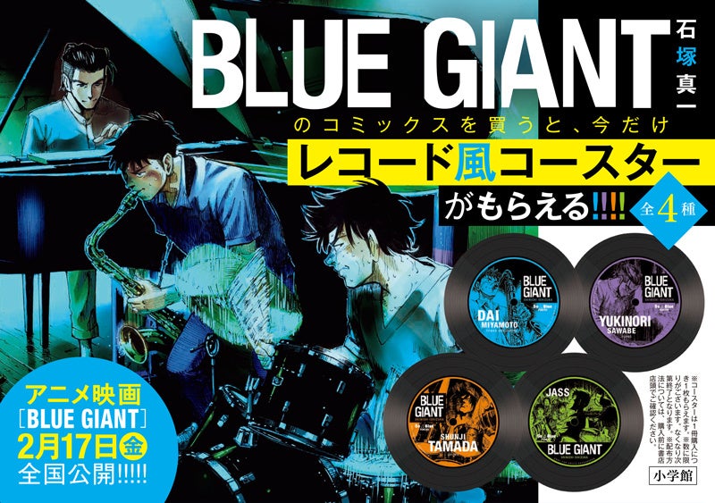 アニメ映画「BLUE GIANT」が2月17日(金)に全国公開されるのを記念して、原作コミック『BLUE GIANT』シリーズを購入すると、限定レコード風コースターがもらえる書店フェアが、全国の対象書店で開催中です!