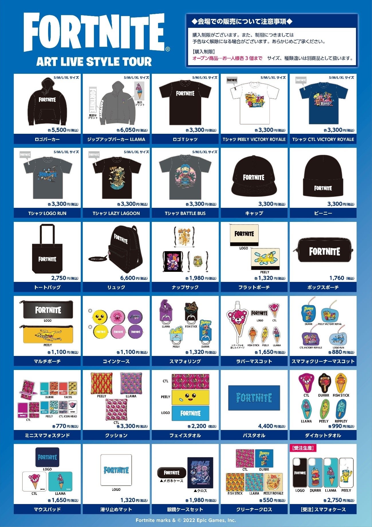 Fortniteファンはポップアップストアにてアパレル、帽子、バックパック、アクセサリーを含むさまざまな商品を購入できます。