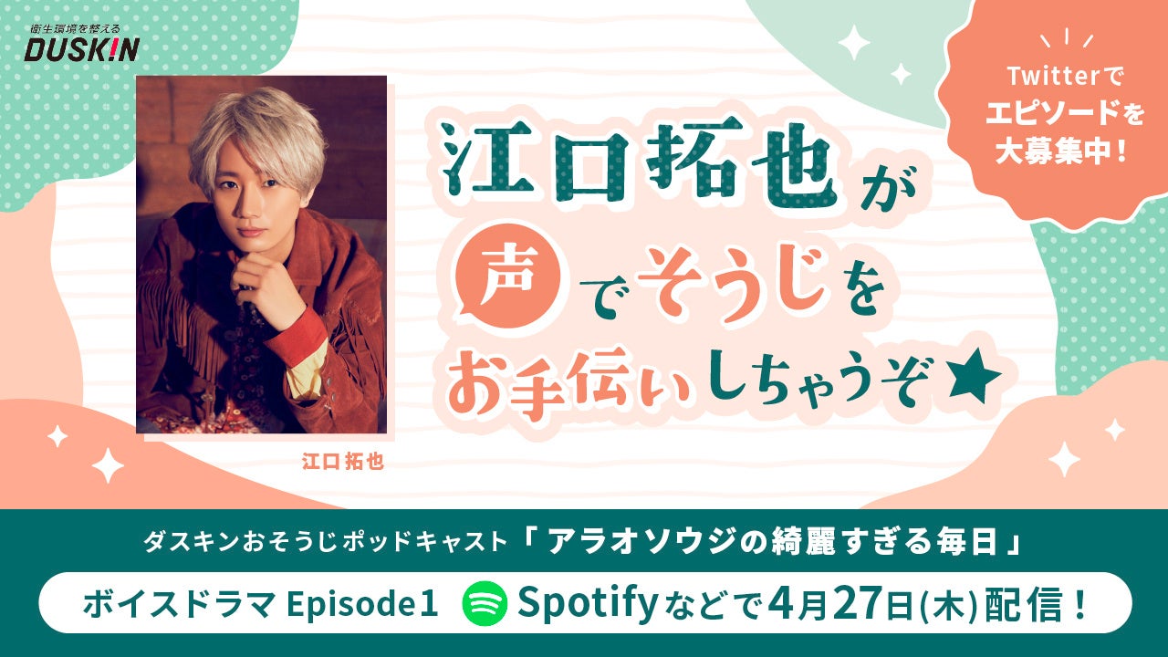 株式会社ダスキン(本社:大阪府吹田市、社長:大久保裕行) は、数々の人気アニメで声優を務める江口拓也さんを起用した【ダスキンおそうじポッドキャスト】にて、掃除や家事の時間がちょっと楽しくなるボイスドラマ「アラオソウジの綺麗すぎる毎日」を2023年4月27日(木)より開始します。